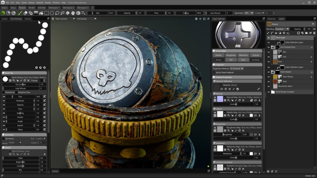 Uma das mudanças mais impactantes no Toolbag 5 é o suporte a UDIMs e múltiplos conjuntos de textura. Agora você pode trabalhar com UVs complexos (vários “tiles”) diretamente no Toolbag, fazer pintura 3D, criar camadas de preenchimento e misturar detalhes de forma muito mais controlada.